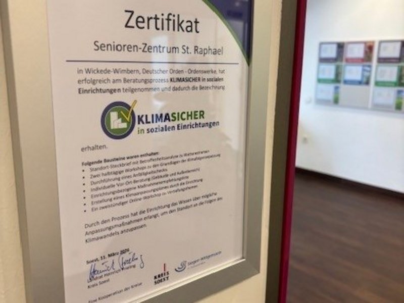 Wir haben erfolgreich am Projekt „KlimaSicher“ des Kreises Soest teilgenommen und wurden im Rahmen eines strukturierten Beratungsprozesses zur Klimaanpassung zertifiziert. Ziel des Projekts ist es, Einrichtungen – insbesondere aus der Sozial- und Gesundheitsbranche – widerstandsfähiger gegenüber den Folgen des Klimawandels zu machen.