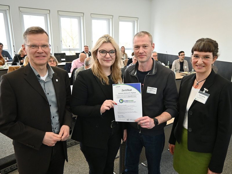 Kreis-Dezernent für Regionalentwicklung Peter Franken und Klimaanpassungsmanagerin Eva Lüning überreichten das Zertifikat „KlimaSicher in sozialen Einrichtungen“ an Laura Hesse (Einrichtungsleitung) und Andreas Felbusch (Haustechnik).